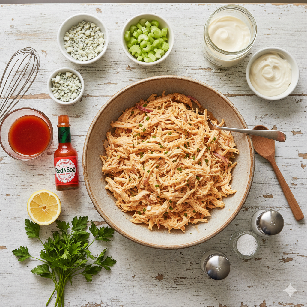 Craving a dish that is both spicy and creamy? Imagine mixing tender shredded chicken with a zesty buffalo dressing. Then, you add crisp celery and fresh green onions for a perfect crunch.