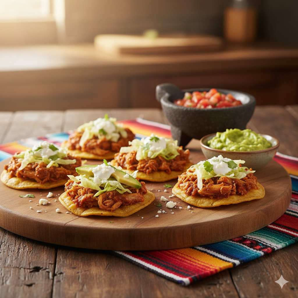 Mini Chicken Tinga Tostadas are truly spectacular party bites – offering a delightful crunch from the crispy tortilla, followed by the savory, slightly smoky, and spicy goodness of shredded chicken in a rich tomato-chipotle sauce.