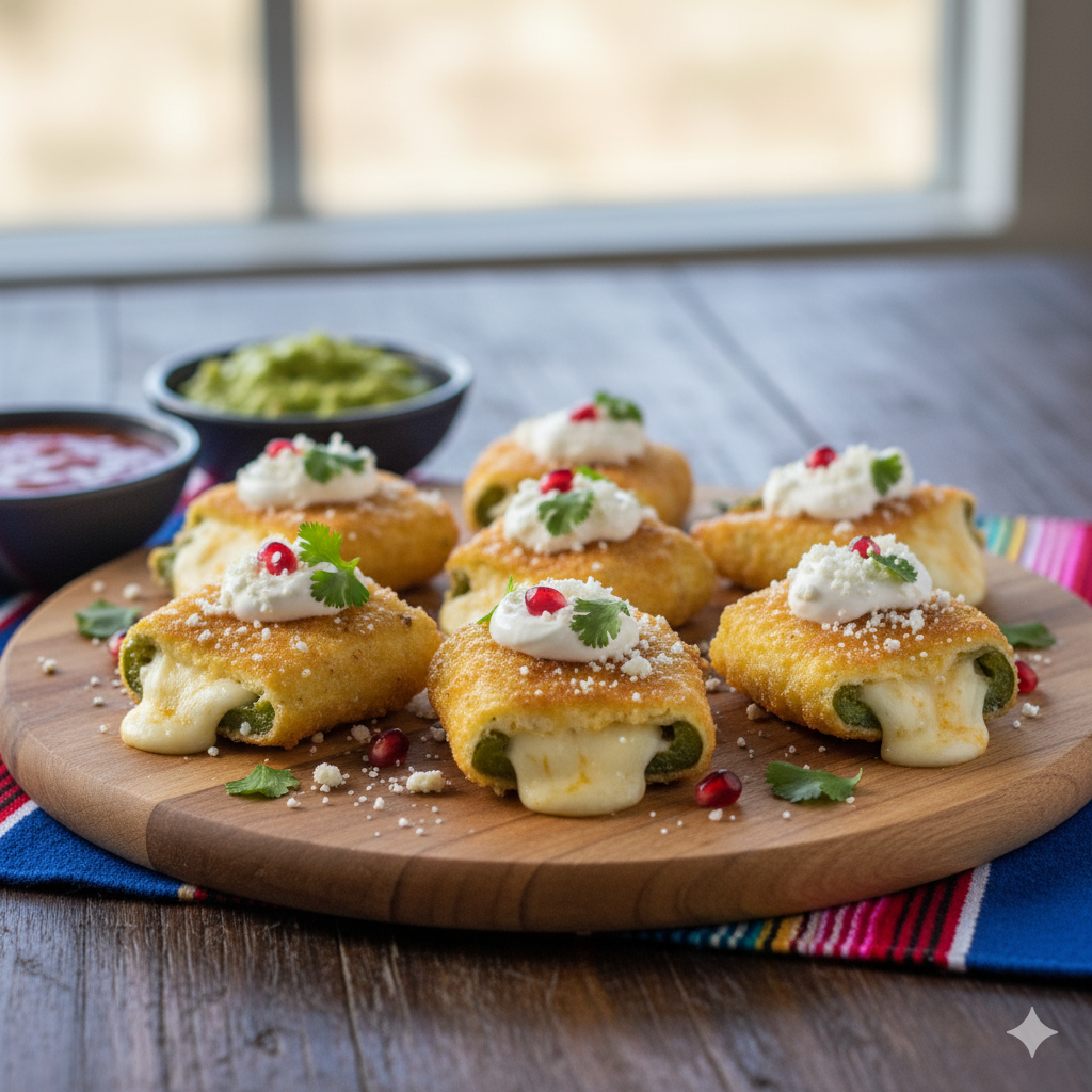 Roasted poblano peppers are stuffed with a delicious, melty cheese filling, then lightly breaded and fried (or baked) until golden and crispy. They’re savory, slightly spicy, wonderfully cheesy, and a truly impressive bite-sized treat for any Mexican feast.